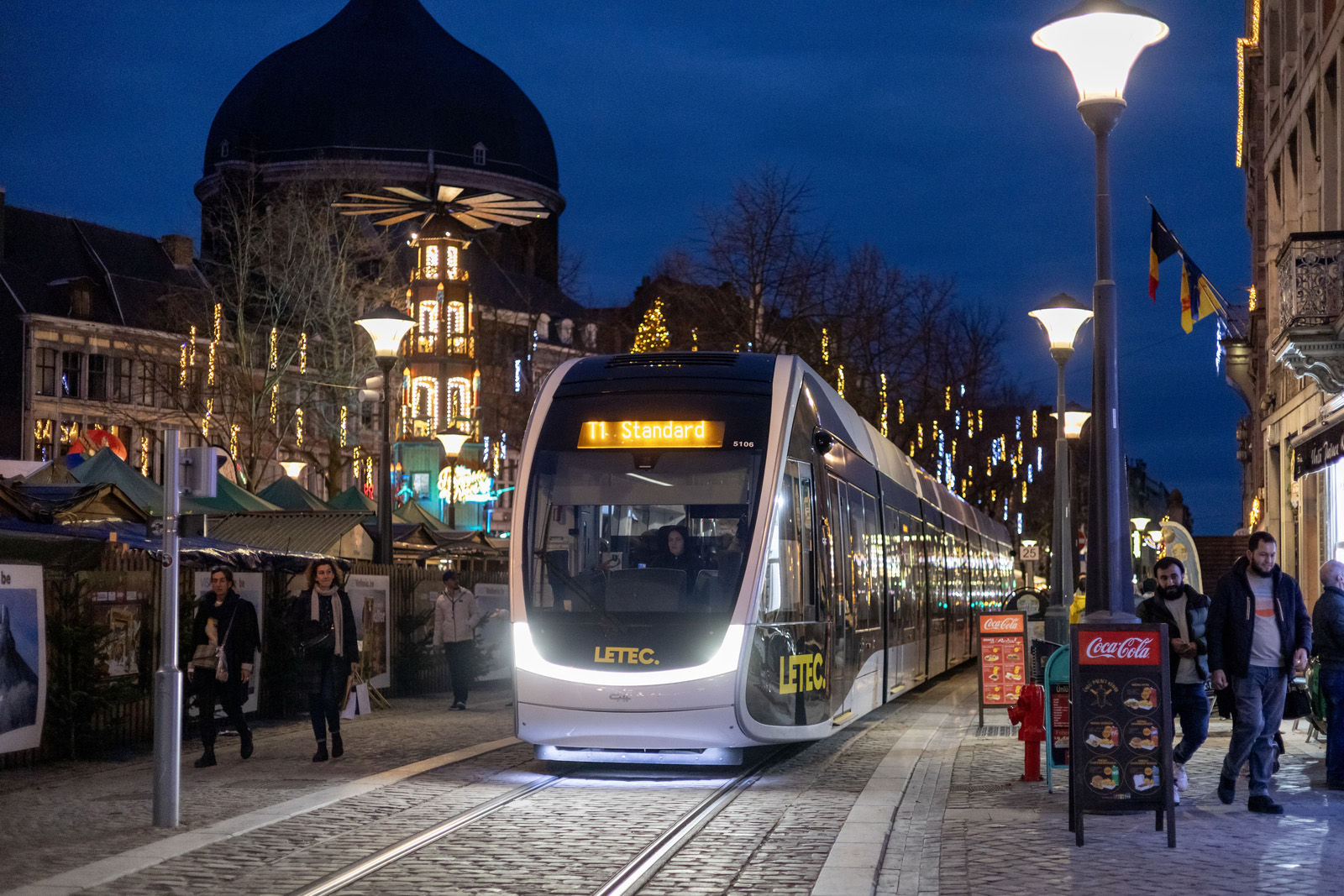 Pour la première fois cette année, tram et marché de Noël se côtoient à Liège, permettant la réalisation de beaux clichés mettant en exergue les lumières de Noël, comme ici avec la motrice 5106 à hauteur de la rue de Bex